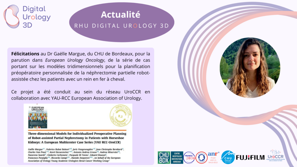 Publication dans European Urology Oncology de la série de cas du Dr Gaëlle Margue – 2025 Three-dimensional Models for Individualized Preoperative Planning of Robot-assisted Partial Nephrectomy in Patients with Horseshoe Kidneys : A European Multicenter Case Series (YAU RCC-UroCCR) Retrouvez l’article en cliquant sur ce lien.